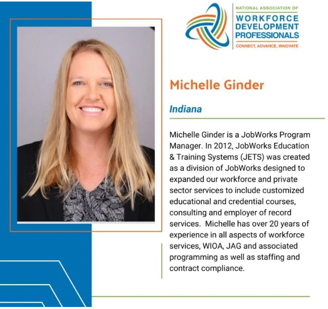 “Meet Michelle Ginder, representing the state of Indiana on the NAWDP Board of Directors. With over 20 years of experience in multiple areas of workforce, Ginder brings extensive knowledge to the Board. She also serves NAWDP and its Board by participating as a member of our Programming Committee. Please help us express our gratitude to Michelle Ginder for her work as a member of the NAWDP Board of Directors!